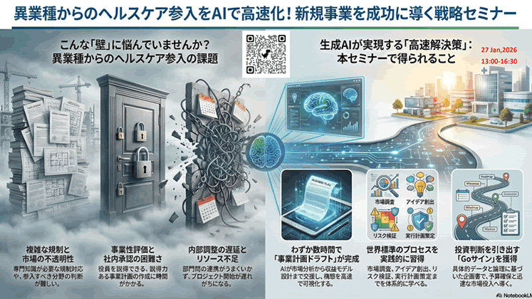 本講座は、異業種からヘルスケア・ウェルネス分野への参入を検討するR&Dリーダーや新規事業担当者を対象に、生成AIを活用した戦略構想の実践を体験するハンズオン型プログラムです。自社の技術を起点に、医療・健康領域での応用可能性を探索し、AIとの共創により市場分析・事業仮説・収益モデル・実行計画を短時間で可視化します。わずか3時間半で「役員のGoサインを引き出せる」ミニ事業計画のドラフトを完成。理論よりも実践に重きを置き、明日からの戦略検討に即活かせる構想力を磨きます。